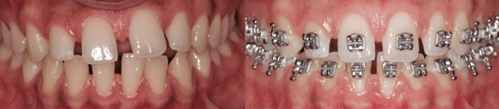 Afb. 1. Beginsituatie en tijdens de orthodontische behandeling.