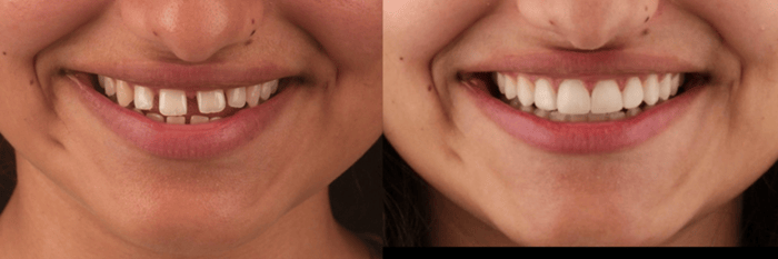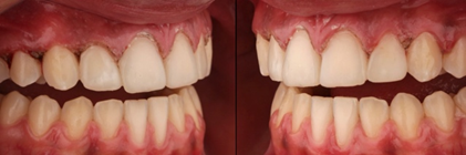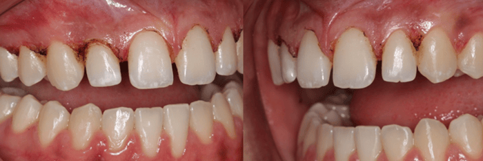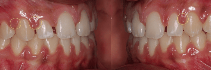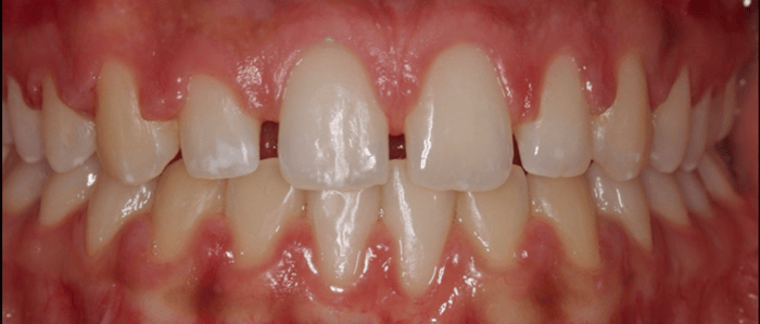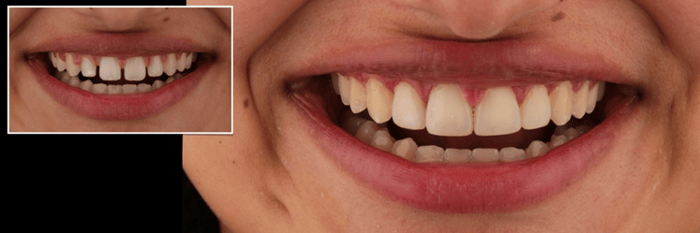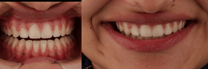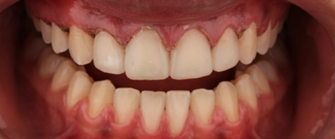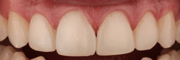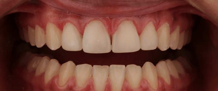 Na afronding van de orthodontische behandeling was sprake van een evenwichtige occlusie en gebitsuitlijning. De aanzienlijke approximale ruimtes in het front en de onregelmatigheden in de gingivarand hadden echter invloed op het algehele uiterlijk (afb. 2).
