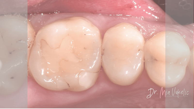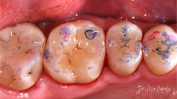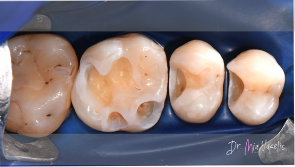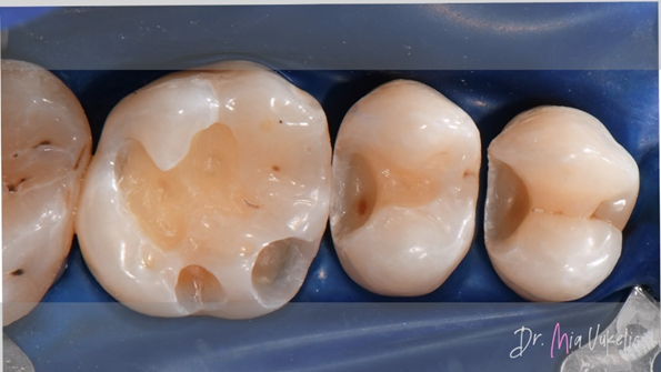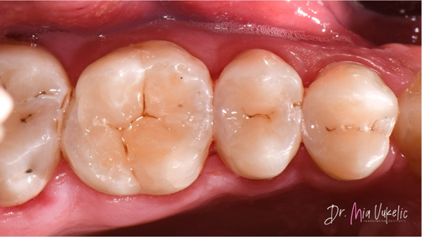 De patiënt bezocht de kliniek voor een jaarlijkse controle. Uit het klinisch en röntgenonderzoek bleek een secundaire cariëslaesie op het occlusale vlak van gebitselement 26 en twee cariëslaesies op de distale vlakken van gebitselement 24 en 25. De patiënt meldde geen specifieke symptomen. De voorgeschreven behandeling bestaat uit het aanbrengen van een klasse I-restauratie op gebitselement 26 en klasse II-restauraties op gebitselement 24 en 25.