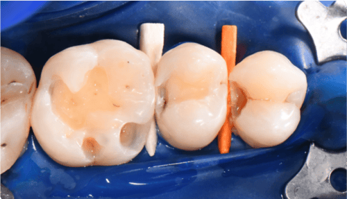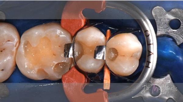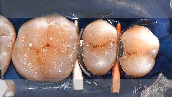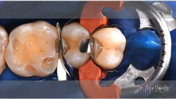 Voor het herstel van de approximale wand werden Halo™-matrixbanden en een Halo™-ring van Ultradent Products gebruikt.